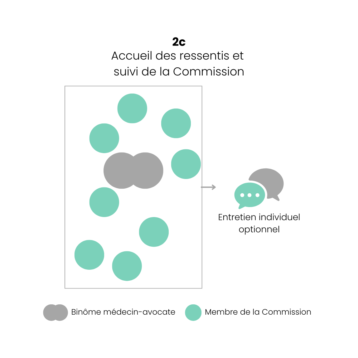 La Commission est reçue par le binôme médecin-avocate qui lui explique le fonctionnement. Les personnes ont reçu préalablement un dépliant. Ce premier temps d’accueil est court.